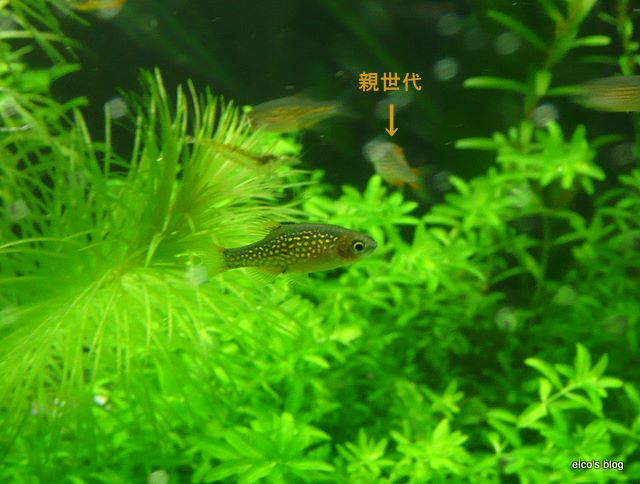 画像の中に親世代が1尾だけ写っていますが、ぼやけていながらも各鰭の赤い発色が強いのがこの画像でも分かります。