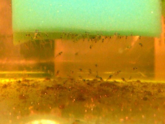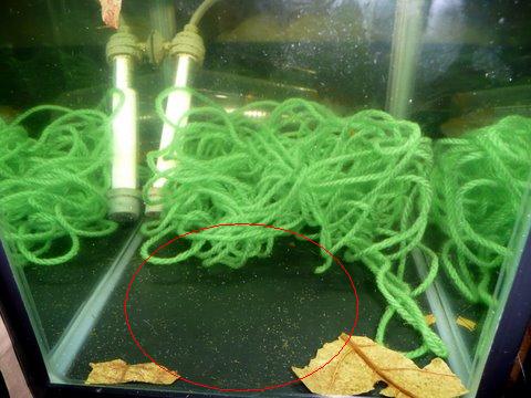 (100均のスポンジを使ったフィルターにぶら下がってます。下に群がっているのは先生まれ群)