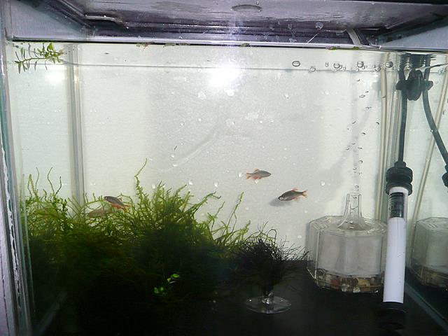 エアーは少なめ、インフゾリアがいると見込んで、水草水槽の表面に浮いていた枯葉をとって浮かべ、底にはウィローモス。
