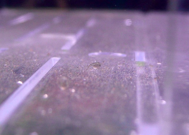 前の日に水槽面が藻で曇りかけていたので、コケ取りをやっていたところ、勢い余って僕の手が作った水流で底砂が少し撒き上がりました。